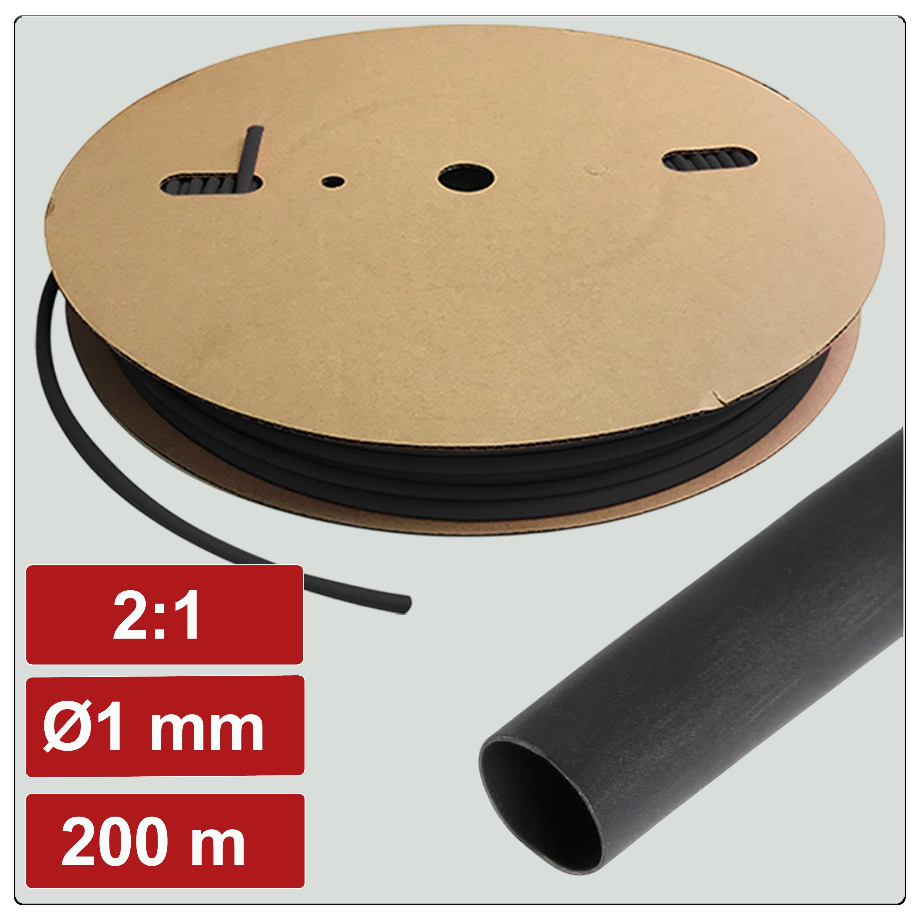 - 1 × Schrumpfschlauch-Rolle, 1 mm Durchmesser, 2:1 Schrumpfrate, Länge 200 m